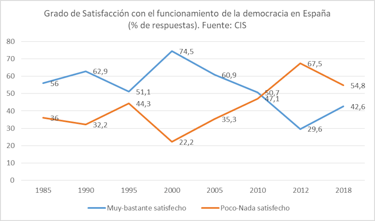 En España, los datos del CIS muestran que el grado de satisfacción de la ciudadanía con la democracia empeoró entre 2000 y 2012, tendencia que se vio agudizada por la crisis de 2008. Los últimos datos disponibles, de 2018, muestran que son más los ciudadanos que se muestran poco a nada satisfechos con el sistema (54,8%) que aquellos que están muy o bastante satisfechos.