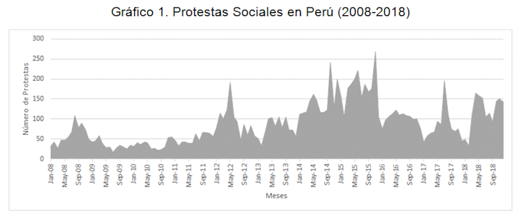 De acuerdo a la Defensoría del Pueblo, entre 2008 y 2018 hubo más de 11.600 protestas en todo el país. El 23% de estas involucraron por lo menos un acto de violencia. Solamente en Lima metropolitana hubo 1.120 protestas. Esta misma semana hubo protestas tanto en el sur como en el norte en contra de empresas mineras, una huelga de mineros y una huelga de transportistas informales en Lima. Es inusual no ver protestas en Perú.